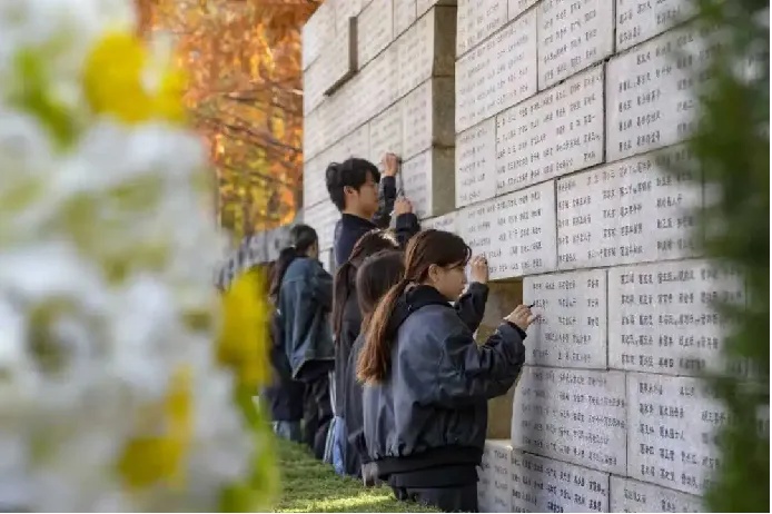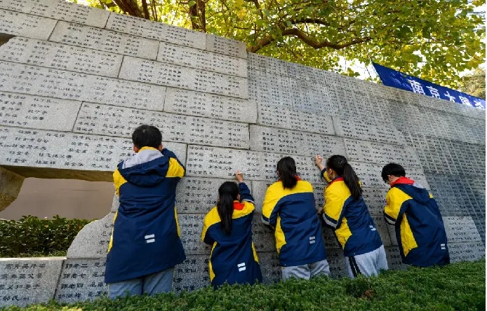 青灰色石墙上高悬着青松枝叶,黄白菊花组成庄严的“奠”字花环股票10倍杠杆,密密麻麻的名字无声诉说着历史的伤痛。