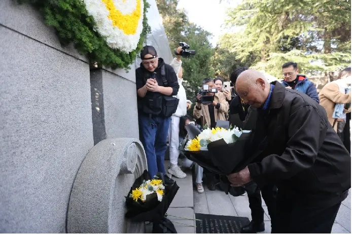 96岁的夏淑琴在外孙女、首批南京大屠杀历史记忆传承人夏媛等人的搀扶下,缓步走到墙前。她凝视着墙上亲人的名字,沉默良久,而后深深鞠躬。那双布满皱纹、微微颤抖的手,将一束黄白相间的菊花,郑重地献于墙下,嘴里念叨着:“88年了,88年了……”